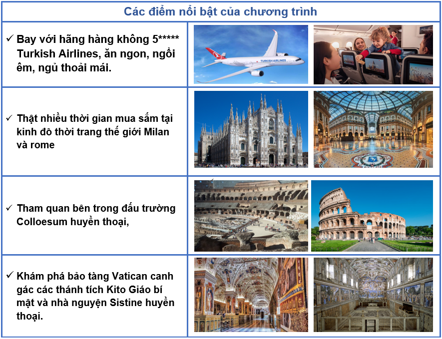 Ý là quốc gia xinh đẹp nằm ở Tây Âu, là điểm đến mơ ước của nhiều du khách trên thế giới và là đất nước của nghệ thuật, tôn giáo và cái nôi của thời kì phục hưng đỉnh cao đưa Châu Âu thoát khỏi đêm trường trung cổ. Hành trình du lịch Thụy Sĩ - Ý sẽ là một chuyến đi đầy cảm xúc hòa mình vào vẻ đẹp của thiên nhiên, nghệ thuật và văn hóa. Bạn sẽ được sống những ngày tháng đáng nhớ, và sẽ mang theo những kỷ niệm đẹp về chuyến đi này.